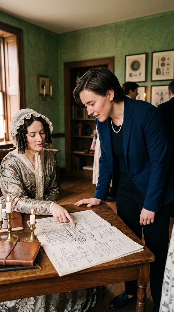 techy portrait with ada lovelace discussing algorithms in period parlor with analytical engine sketches.