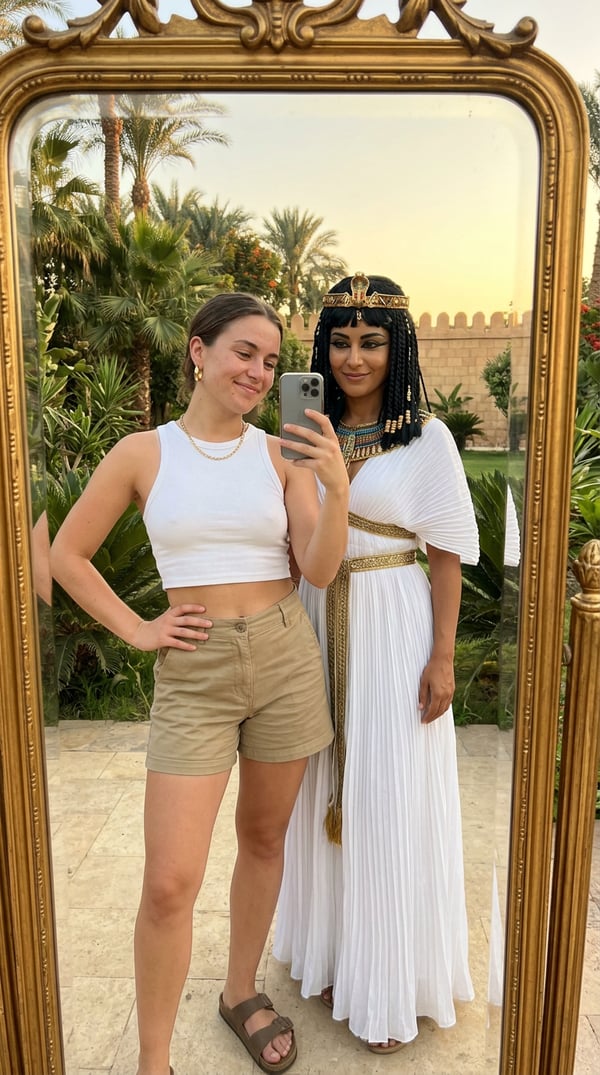 cheeky mirror selfie with cleopatra by the nile river, channeling ancient egyptian royalty in a modern casual twist amid palm trees and river breeze.