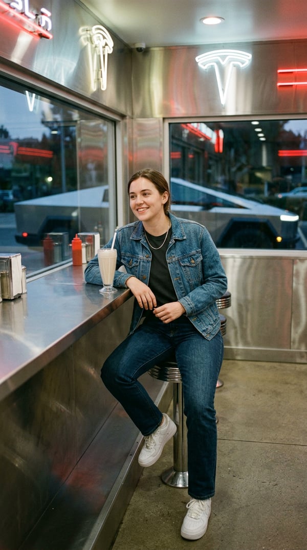 cybertruck diner flex is an AI portrait style created by selfielab on selfielab. chill at the tesla diner built from cybertruck steel, flexing that sold-out vibe. Once purchased, you can use it with any of your characters in selfielab's AI image generator.