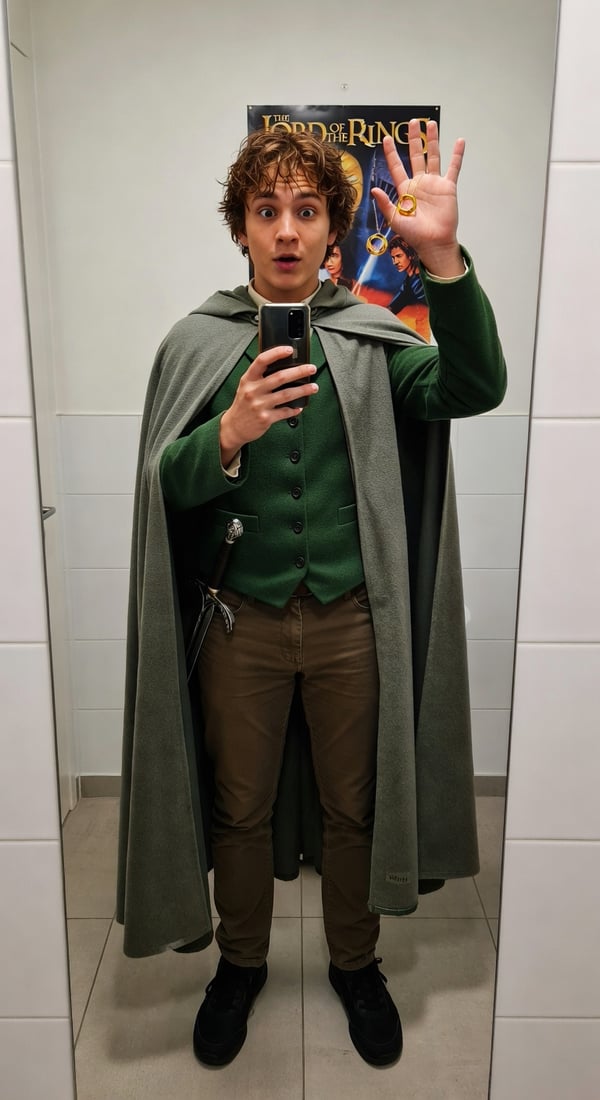 mirror selfie channeling frodo during 25th anniversary rewatch hype. one ring drama in bathroom mirror.