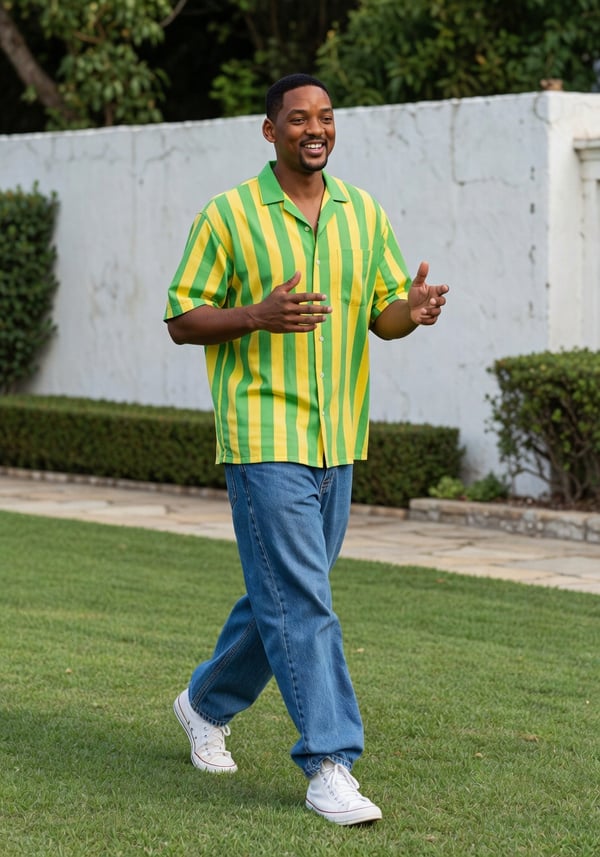 fresh prince swagger in colorful striped shirt and baggy jeans strolling the bel air estate grounds.