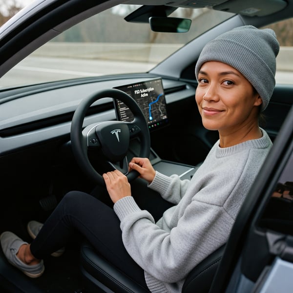 cozy portrait celebrating the tesla fsd subscription shift with unsupervised drive vibes.