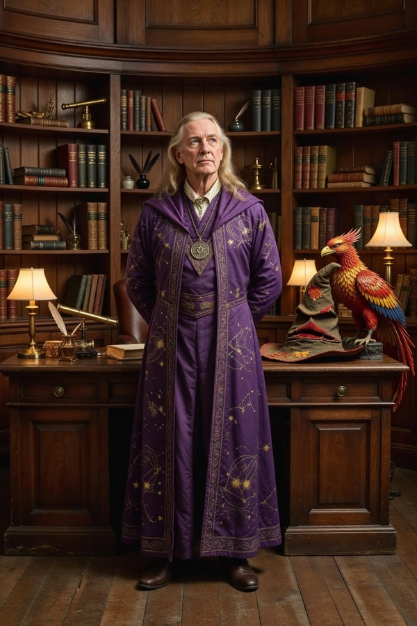 hbo dumbledore wisdom is an AI portrait style created by selfielab on selfielab. channel john lithgow's dumbledore in the circular office with phoenix fawkes and sorting hat. Once purchased, you can use it with any of your characters in selfielab's AI image generator.