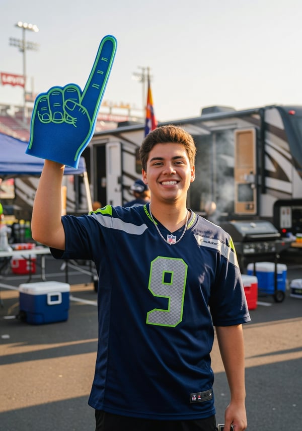 hype up the pre-game vibes at levi's stadium tailgate with foam fingers and team spirit in the california sun.