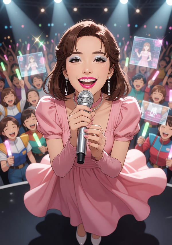 shine as a macross idol like lyn minmay on neon-lit stage, capturing 80s super dimension fortress vibes with dramatic spotlights.