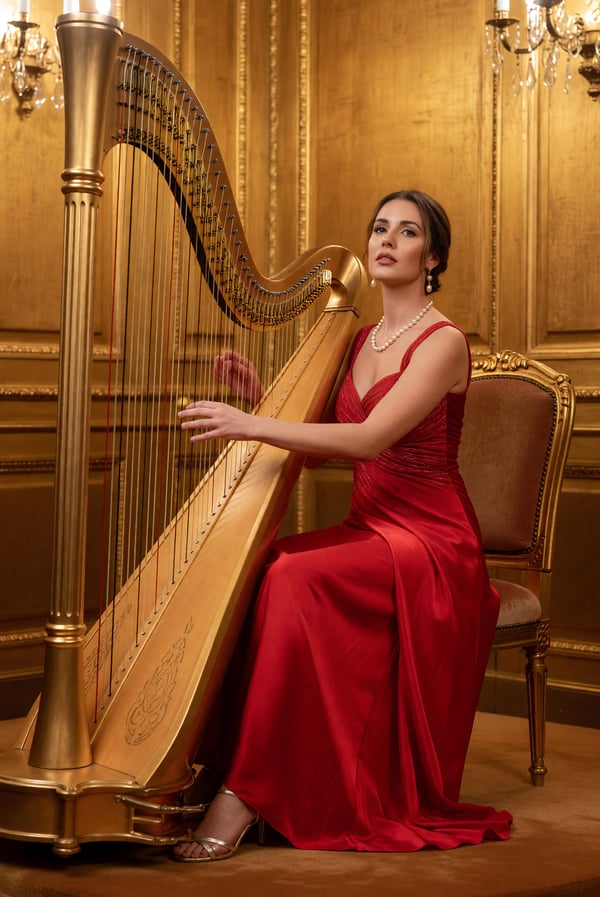 elegant opera house harp serenade from a private box, opulent crimson grandeur.