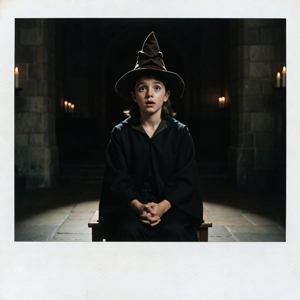 sorting hat ceremony is an AI portrait style created by selfielab on selfielab. await your house fate on the stool in hogwarts great hall during the sorting ceremony. Once purchased, you can use it with any of your characters in selfielab's AI image generator.