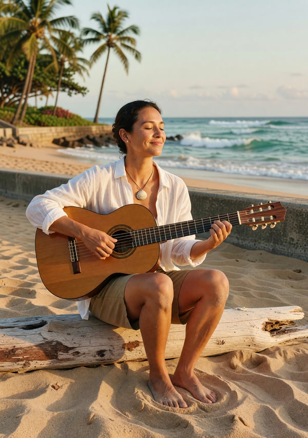 laid-back guitar jamming on a tropical beach at sunset, waves crashing and palm silhouettes.