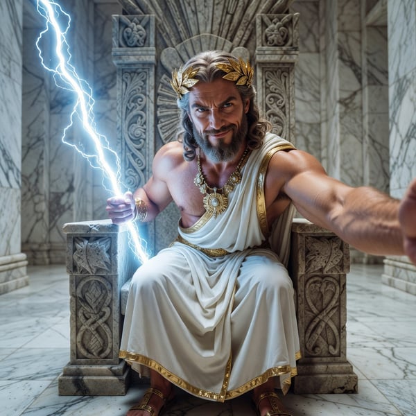 rule as zeus with dramatic lightning selfie on olympus throne, celebrating greek remake reveal.